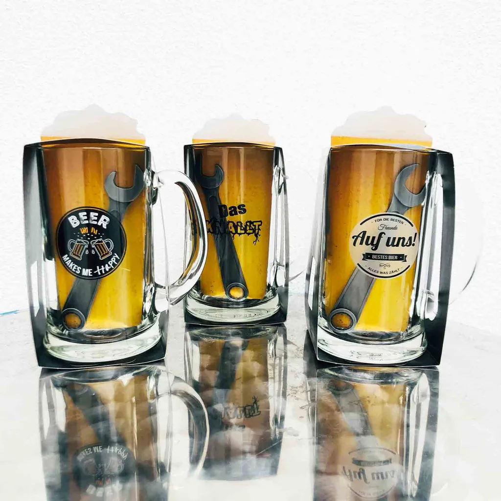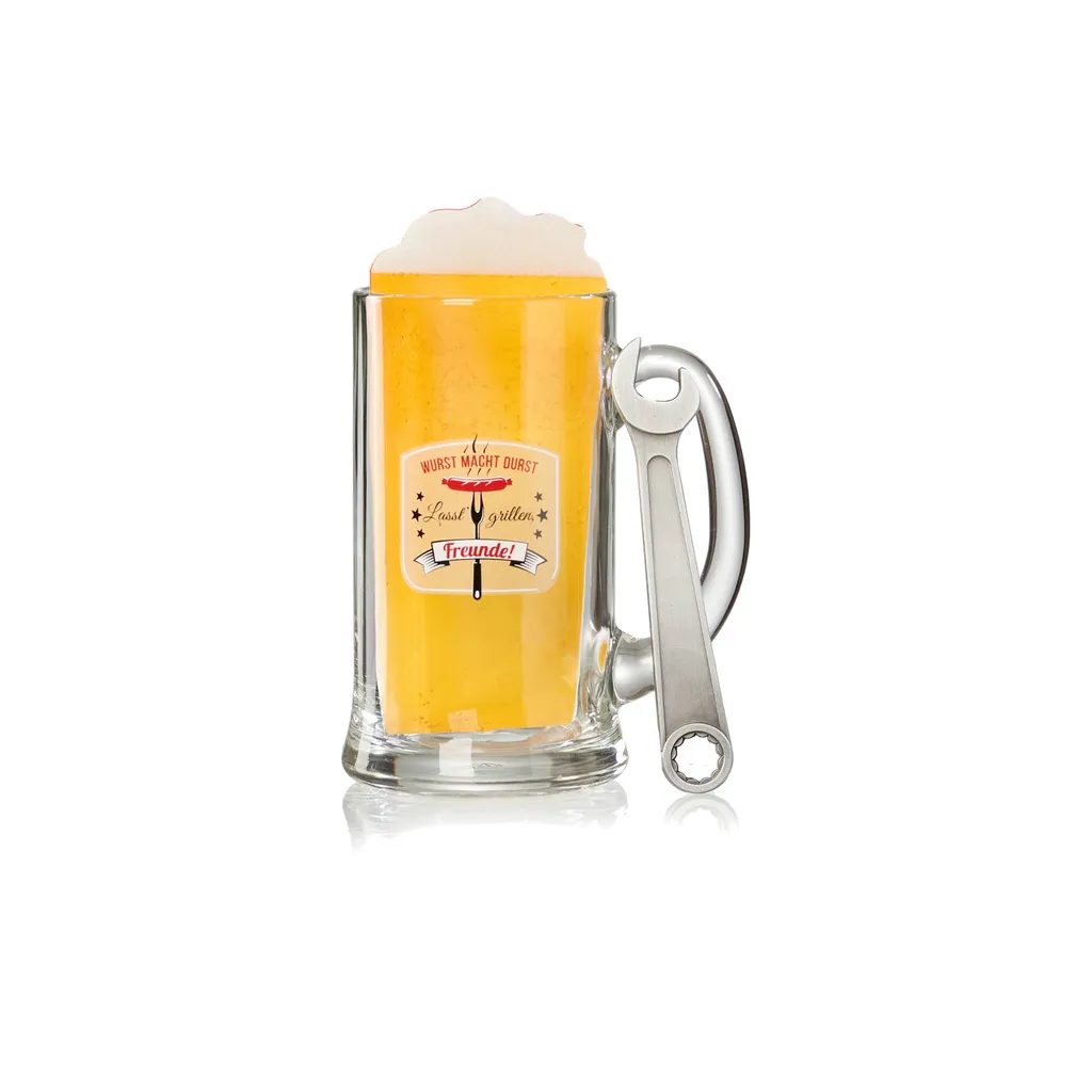 Das Set enthält einen Bierkrug 500 ml und einen Flaschenöffner aus Edelstahl in Form eines Schraubenschlüssels.