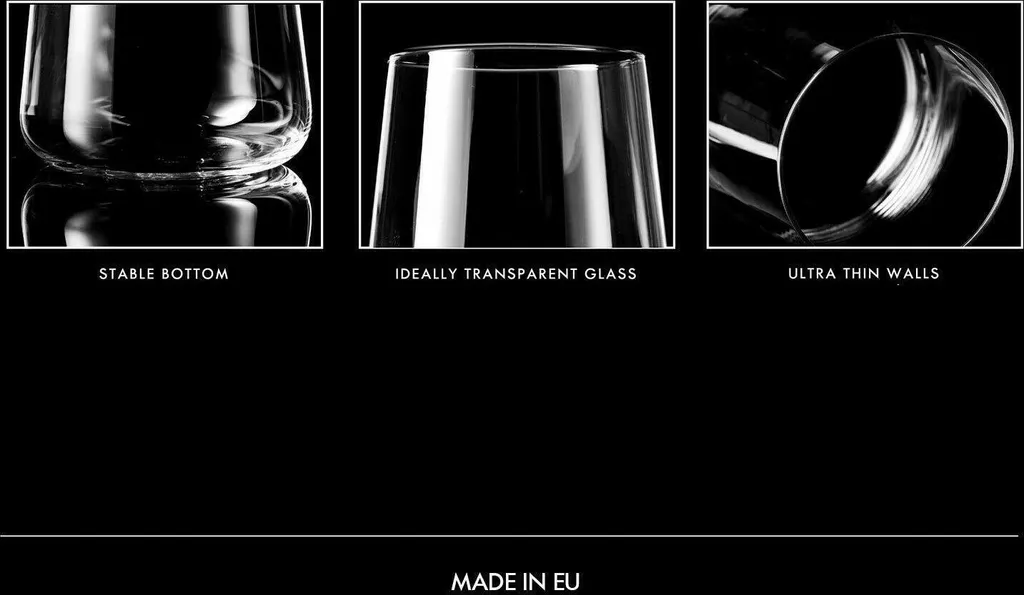 MODERNE FORM – Ein breiterer, stabiler Boden, das Glas, das sich mit einer verstärkten Kante nach oben verjüngt, wird Liebhaber minimalistischer und stilvoller Formen ansprechen. Gläser wurden so entworfen, dass sie sowohl im klassischen als auch in modernen Innenräumen gut aussehen.